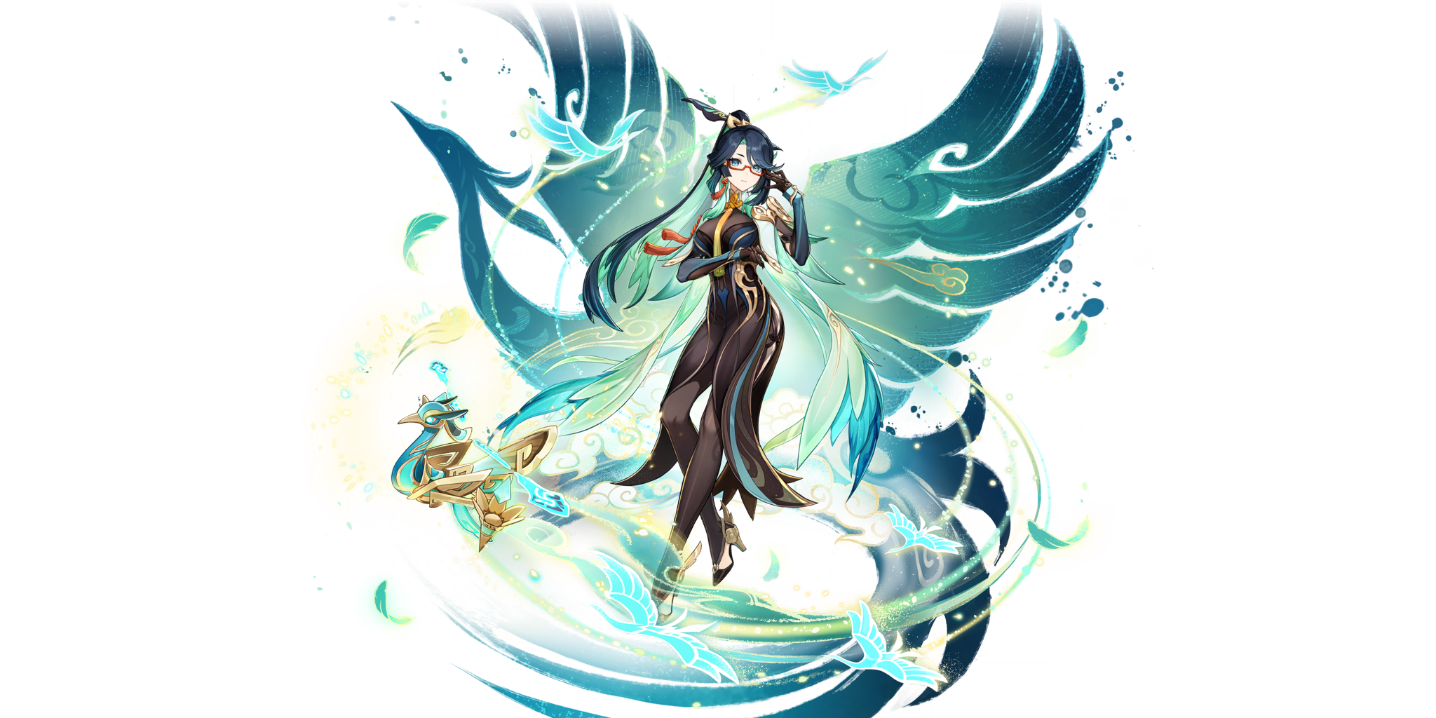 Xianyun is a tall woman with long, navy hair that has light blue undertones. Her hair is tied in a high ponytail secured with a hairpin that resembles the sharpness of a crane. She has shorter eyebrows and wears red glasses. Although Xianyun seems to take the form of a human, she has taloned fingers, like the claws of a crane. Her outfit is flowy and dress-like with many white, greens, blues, and yellows, and she adorns many pendants. She wears high heels and seems to be fond of accessories.
